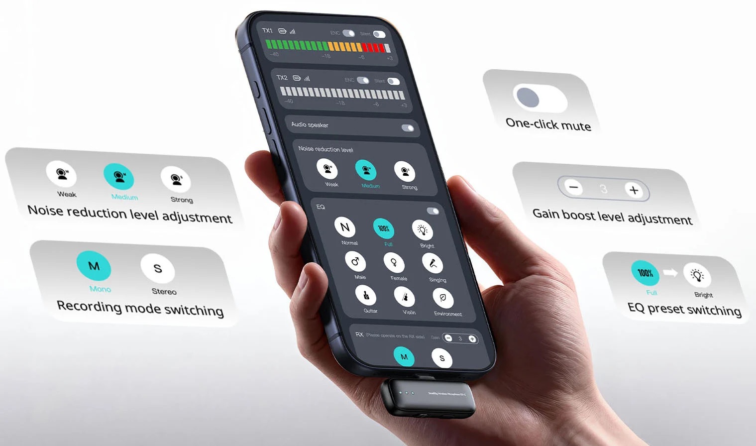 Система поддерживает разные сценарии записи, включая режим с защитной дорожкой, когда параллельно пишется более тихая версия звука на случай резких всплесков громкости. Это особенно полезно при живых выступлениях или непредсказуемых съёмках. Управление сделано интуитивным: основные функции доступны прямо на корпусе, а более тонкие настройки через фирменное приложение SmallGoGo, где можно настраивать эквалайзер и уровни усиления.